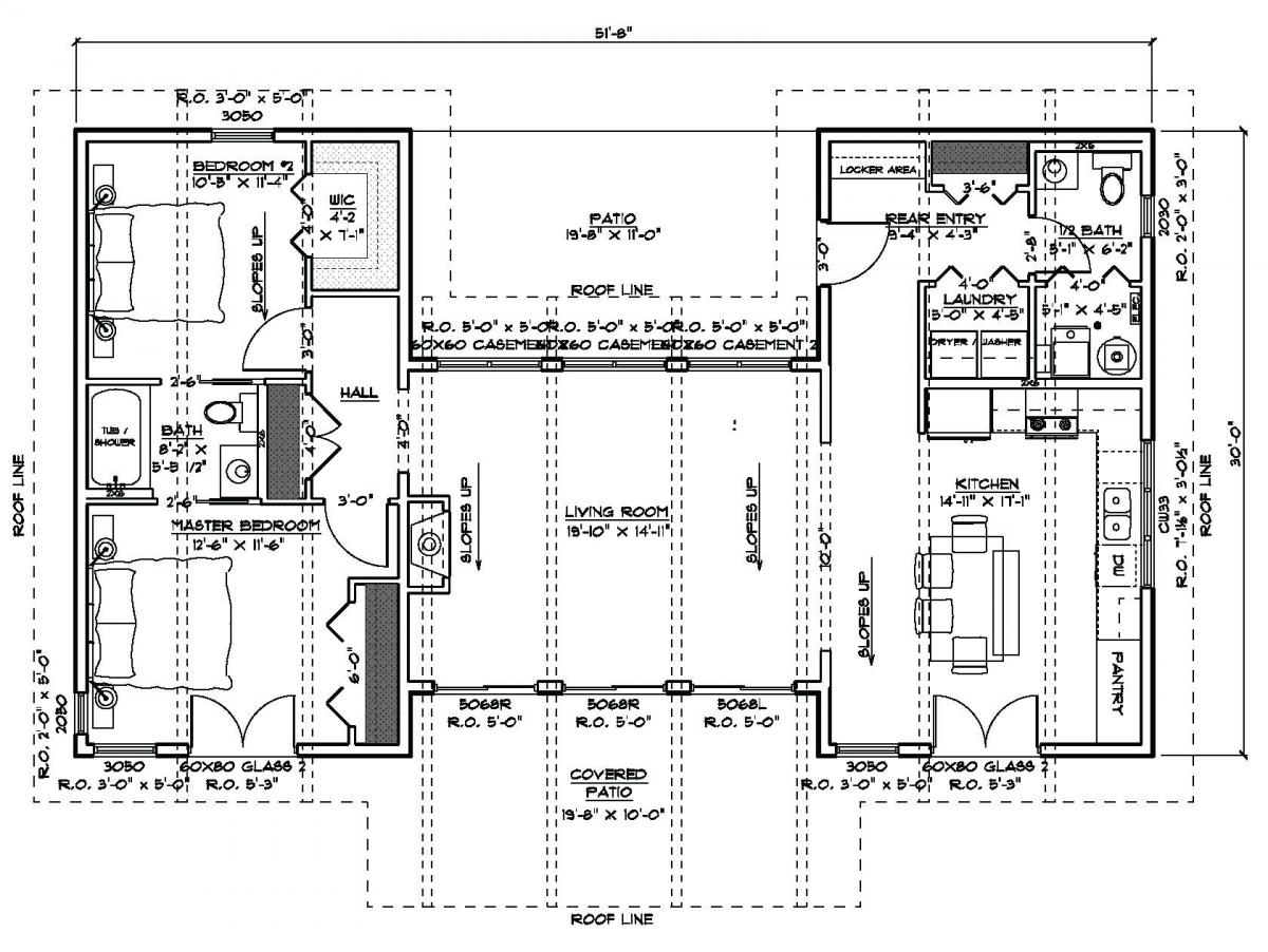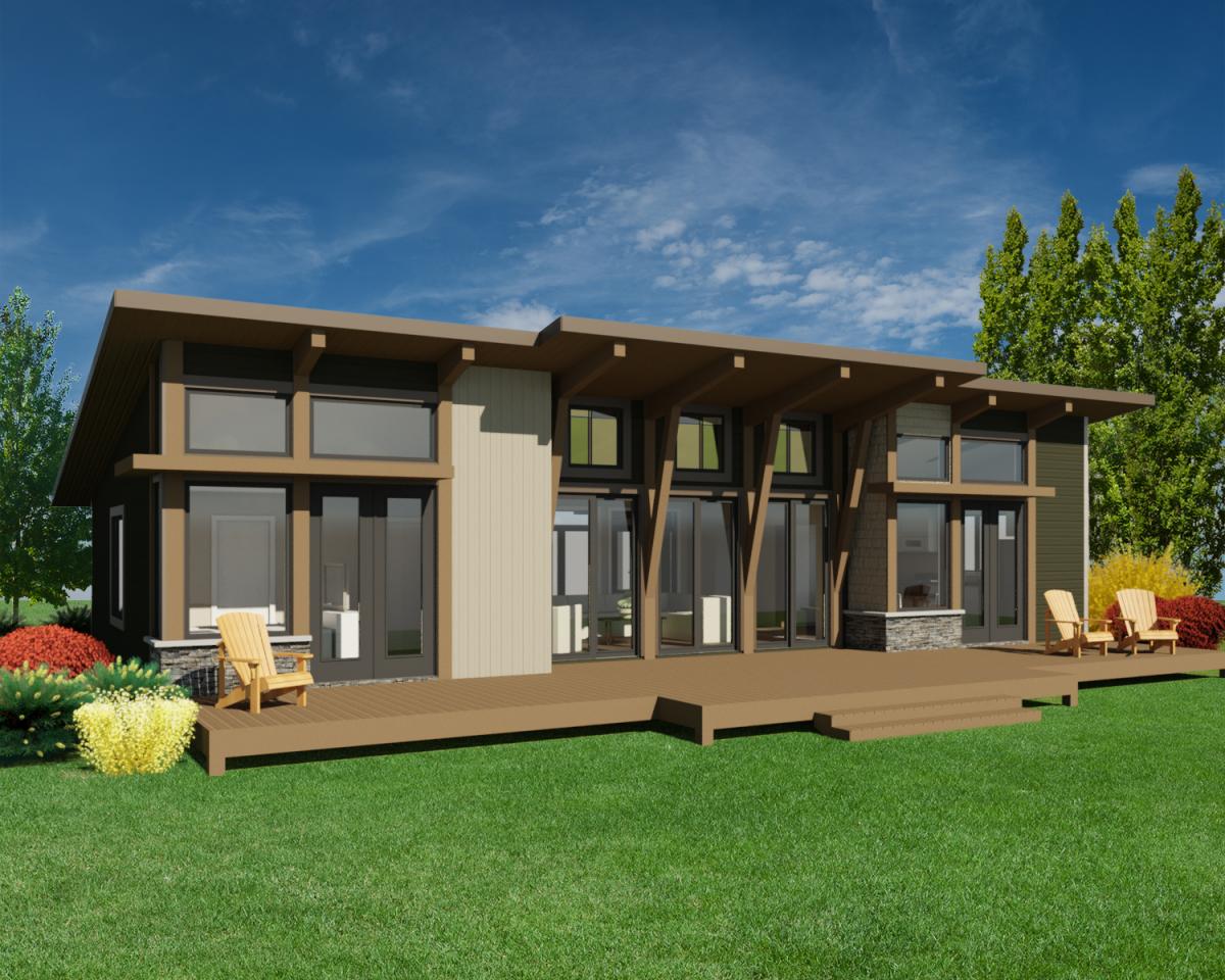 Open spaces and minimization of hallways. Can accommodate a full basement, crawl-space or slab foundation. Design features full-length windows, large overhangs and exposed wood beams. Designed by Robinson Residential Design.