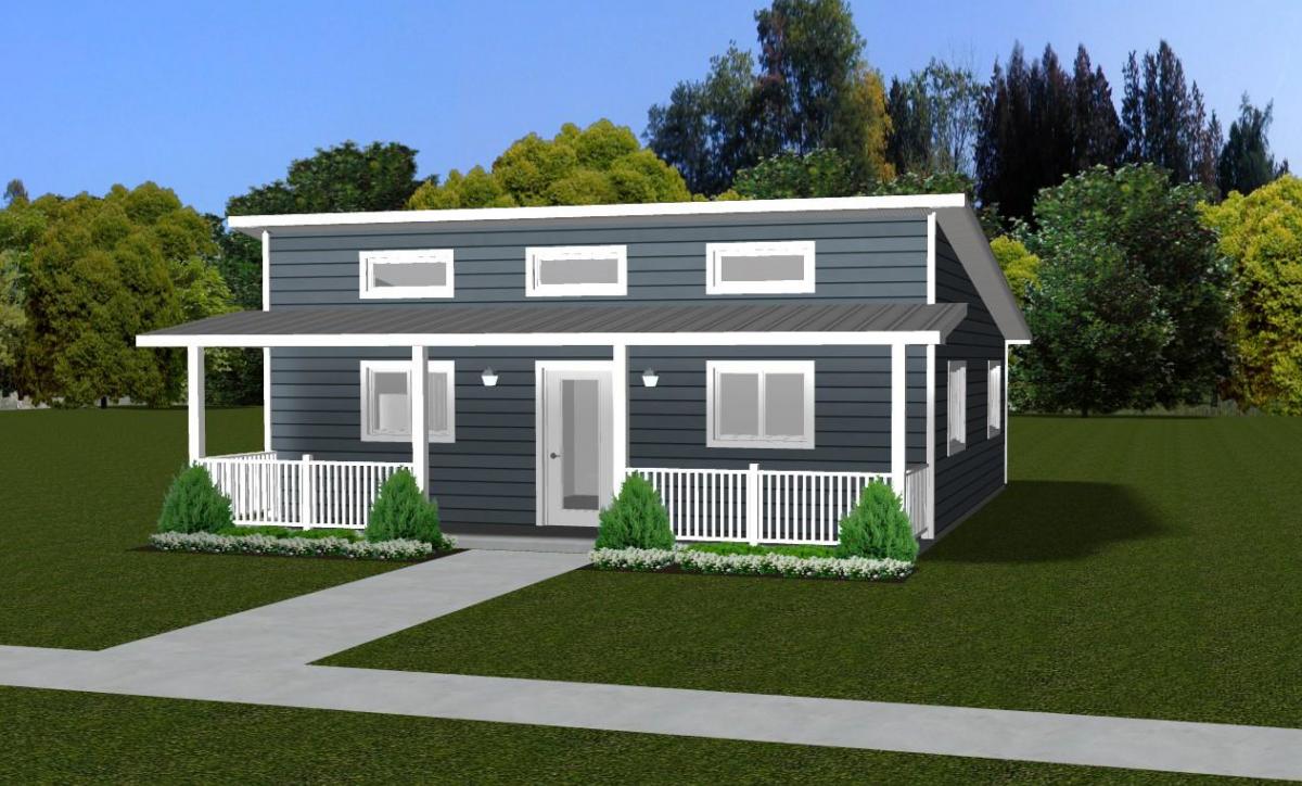 This design features a mono-slope roof and covered porch for the perfect getaway.